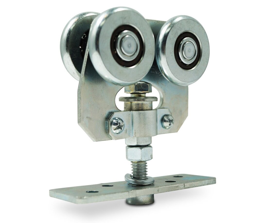 SISTEMA CORREDERA COLGANTE con rodajes de alta precisión. Compuesto de 4 ruedas de METAL. correderas testeadas para funcionamiento continuo en portones de hasta 300 kg. Amplia resistencia y durabilidad en diversos ambientes.