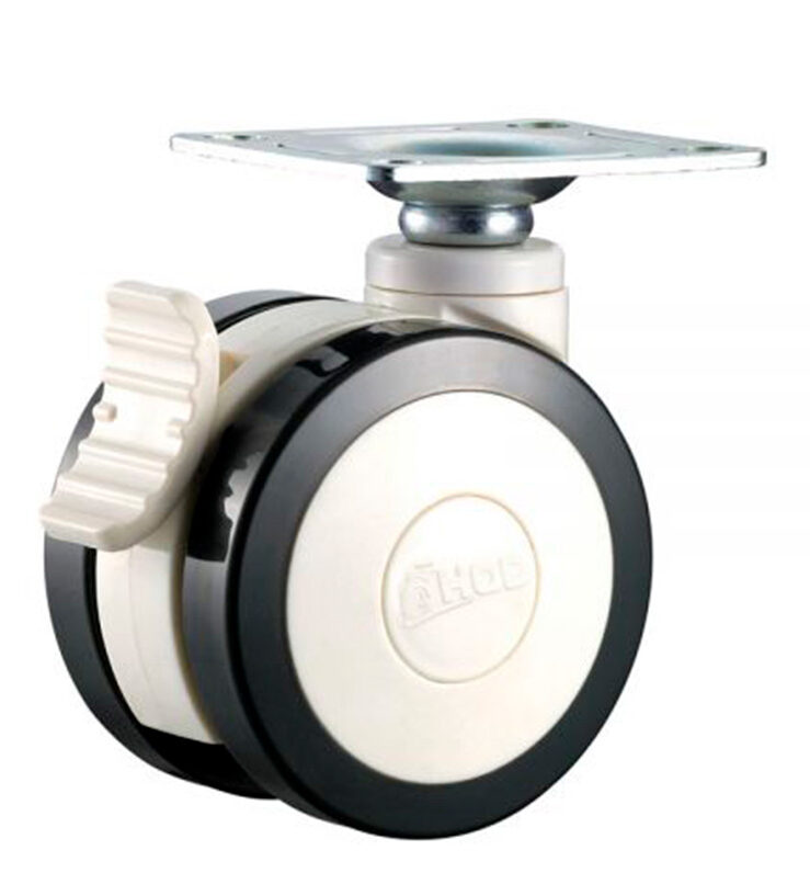 SOPORTE CON FRENO para dos ruedas en polipropileno inyectado de alta resistencia. Cabezote de giro deslizante con 2 rodamientos de esferas de precisión, ideal para maniobras en áreas reducidas.