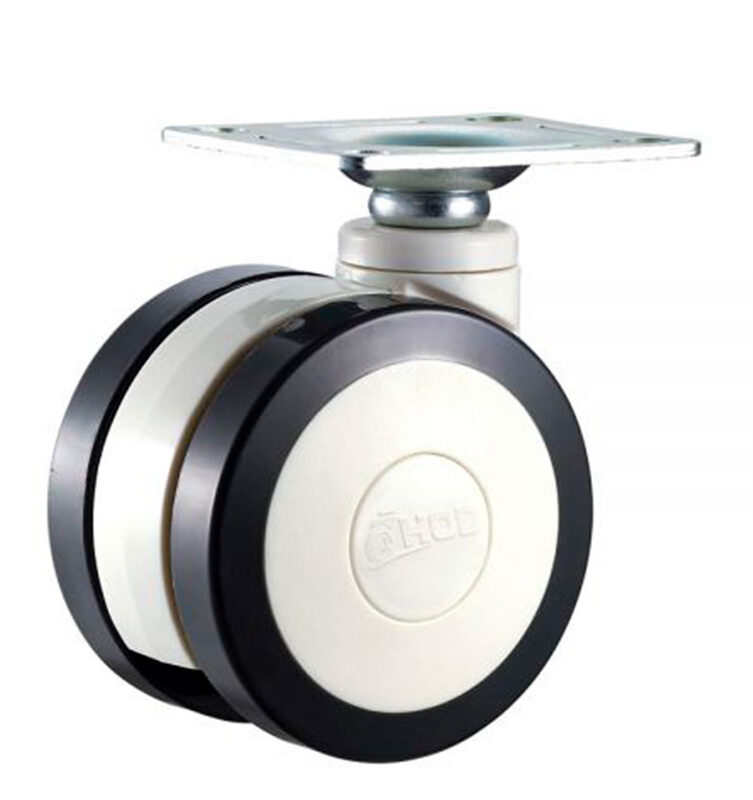 SOPORTE para dos ruedas en polipropileno inyectado de alta resistencia. Cabezote de giro deslizante con 2 rodamientos de esferas de precisión, ideal para maniobras en áreas reducidas.