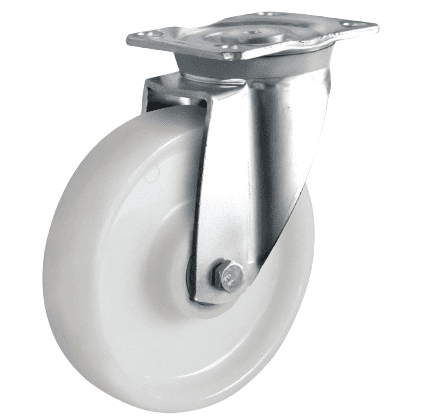 RUEDA: POLIAMIDA (PA) Fundida de Alta Calidad, alta Resistencia a la rotura, dureza 80 shore D, versión pesada, muy robusta, disponible en color BLANCO.