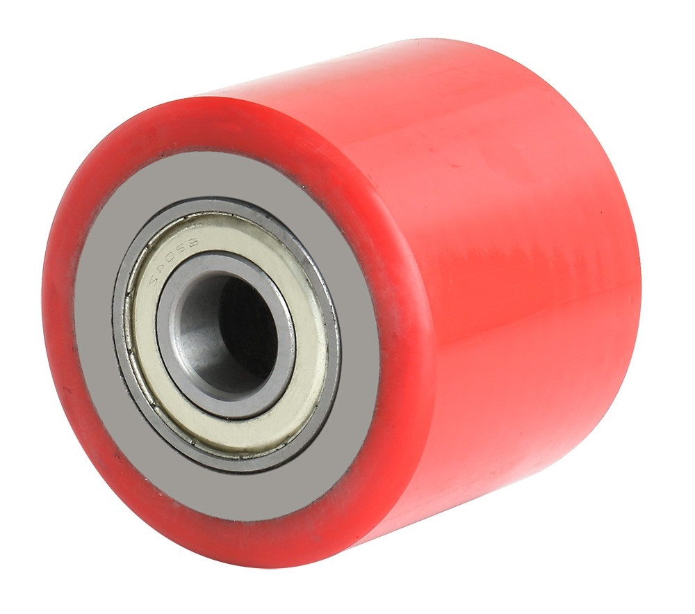 RODILLO fabricado en HIERRO FUNDIDO (FF) vulcanizada en POLIURETANO (PU) con doble rodamiento 6204. Disponible en ROJO.